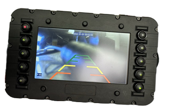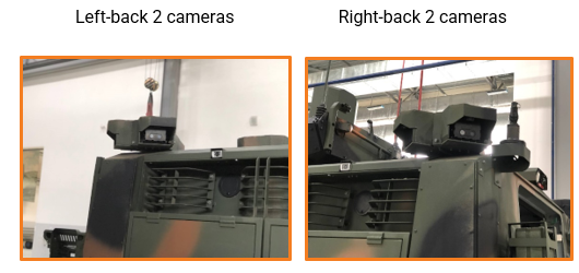 - The system includes three dual cameras at the front, with 120 degrees Field of View, one rear camera at the back of the vehicle, and 3 video monitors inside the driver’s cabin.